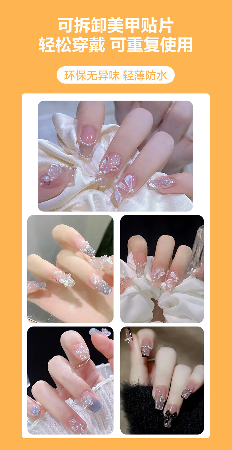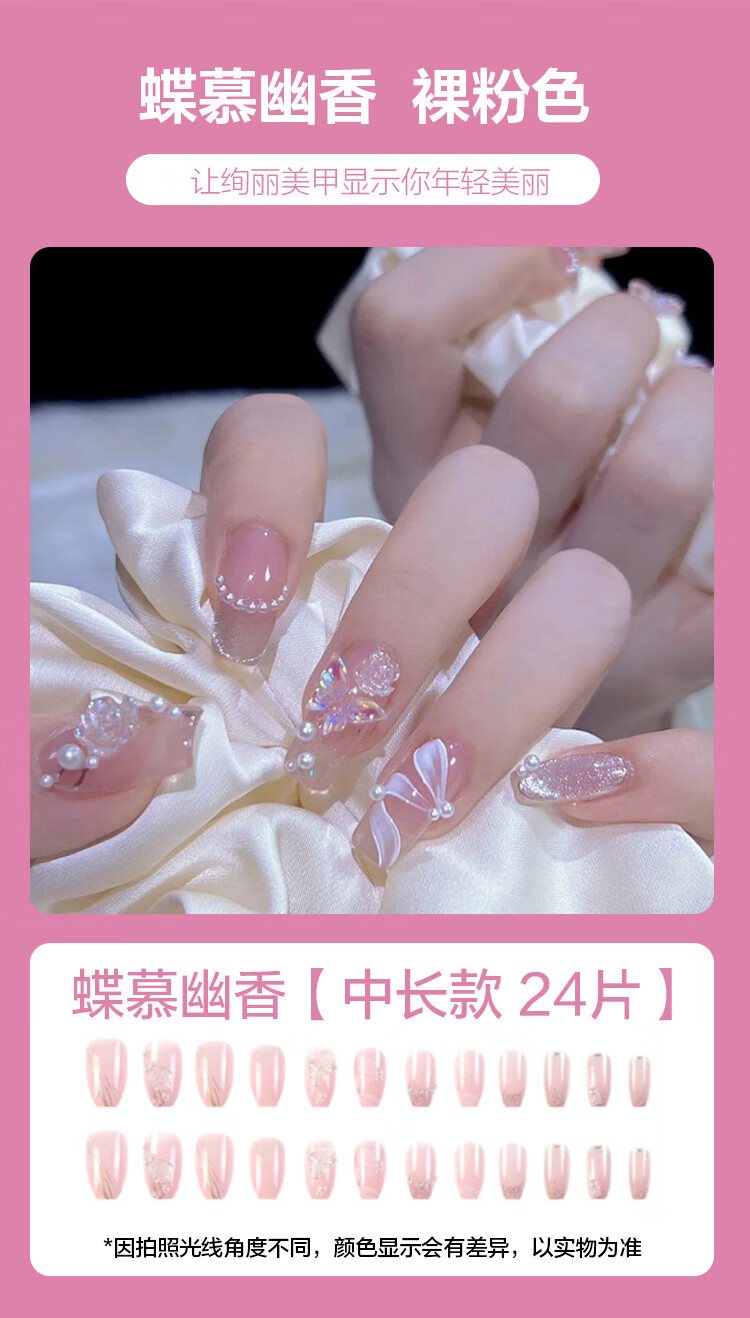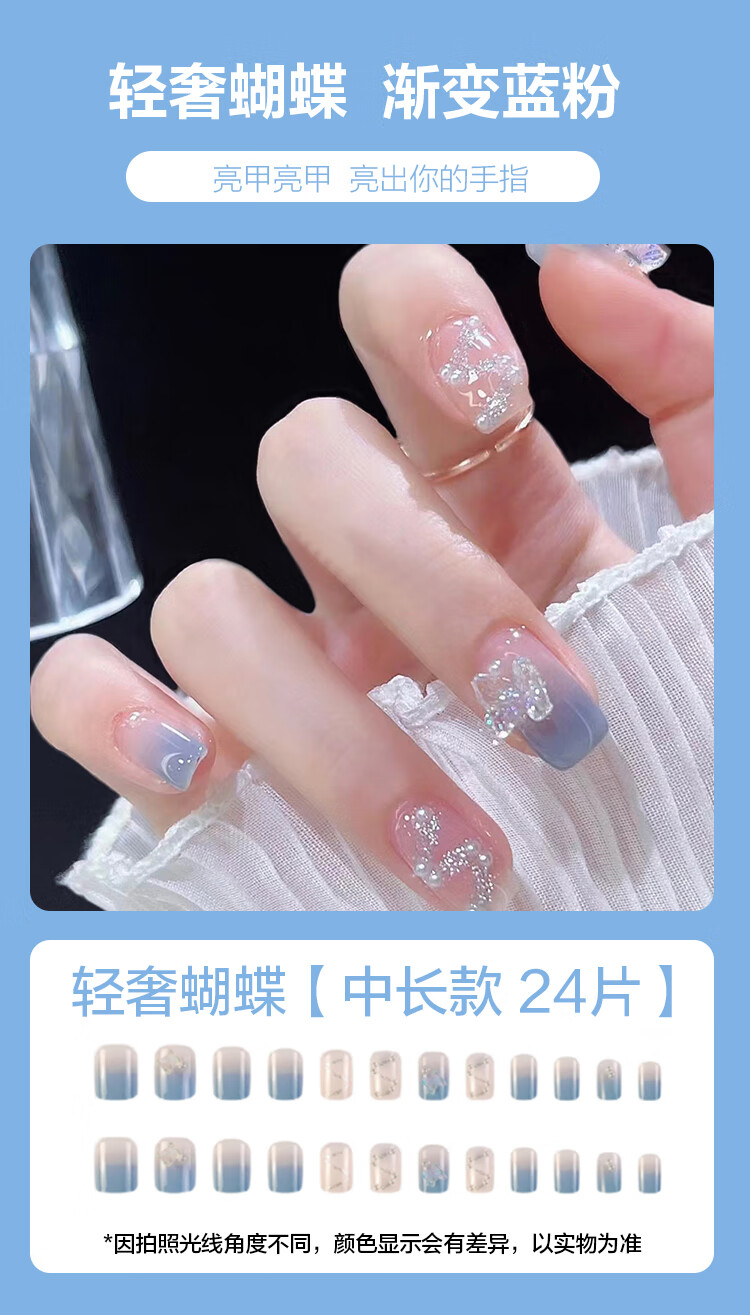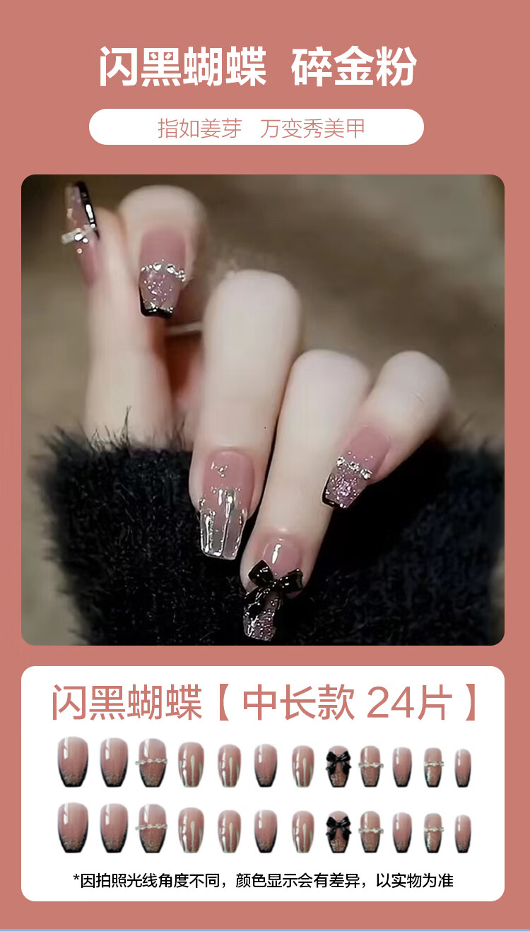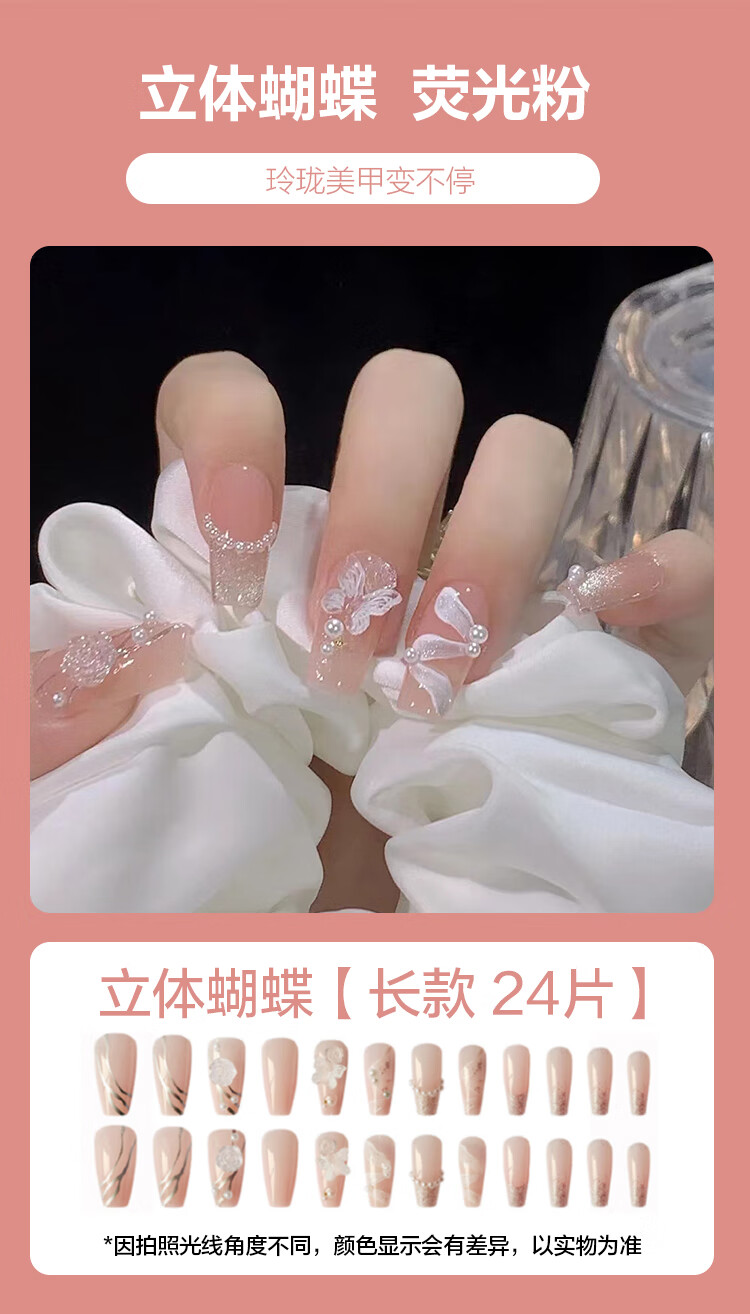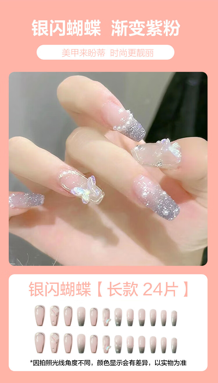 穿戴甲春夏2024年新款高级感短款中长ins风甲片孕妇用成品多巴胺 P139银闪蝴蝶【长款】 24片